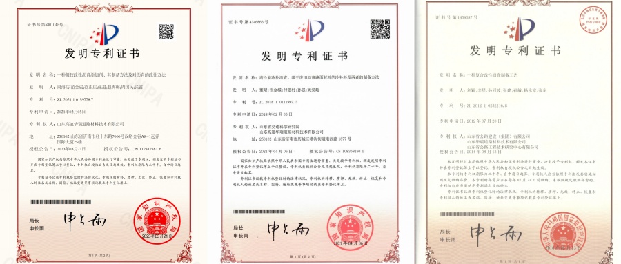 公司研制的MAC改性瀝青獲得了《一種凝膠改性瀝青添加劑、其制備方法及對瀝青的改性方法》和《高性能冷補(bǔ)瀝青、基于廢舊瀝青路面材料的冷補(bǔ)料及兩者的制備方法》等發(fā)明專利授權(quán)。MAC改性瀝青大碎石柔性基層新型路面結(jié)構(gòu)獲得實(shí)用新型專利證書。